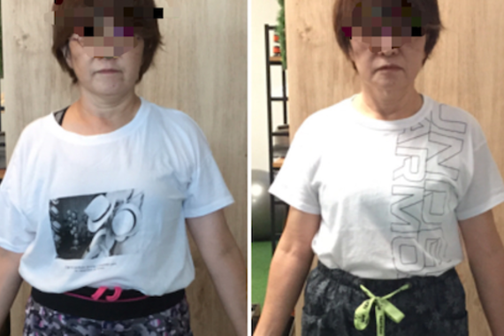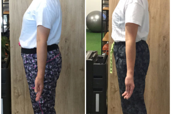 写真をご覧頂ければ一目瞭然と思いますが、左写真はお腹周りがポッコリしているのに大して、右写真で見事に改善に成功しています。